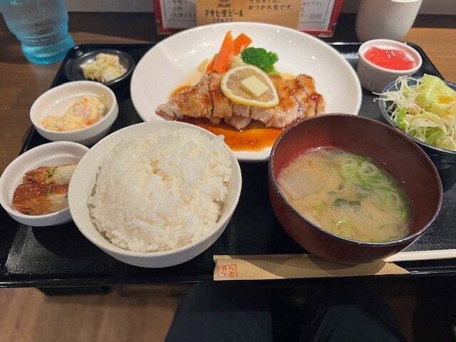 つつじヶ丘 kitchenくらうど京王線つつじヶ丘駅、調布にある急行が停車する駅です。この店は、そのつつじヶ丘駅北口徒歩て数分の路地にある街洋食です。2024年11月開店ですので、つつじヶ丘では新しいお店です。 では、早速中に入りましょう。昼定食が4種類。この店を代表するAのポクテキ和風レモンバターを注文します。1000円!運ばれてきた瞬間、驚きです。見た目からして十分な量のポクテキ。左側には3品。単品のポテトサラダとポクテキの付け合わせのポテトと味が違いますね。こだわりを感じます。右側にサラダとデザート。お肉も柔らかくしっかりした御飯のすすむ味つけでした。CPと味そして量から考えると、まさに圧巻というべきポクテキ定食でした。最後にアイスコーヒー。CP良く、大満足でした。ドリンク用冷蔵ケースを見るとホッピーがありました。店の方にお昼にも頼めるかを聞いたら、頼んで大丈夫だそうです。今度、お昼に頼んでみましょう。これからもつつじが丘でがんばってください。