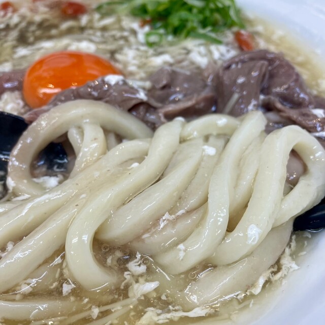 うどんの上には、甘く炒めた牛バラ肉、八代オクラ、とろろ、納豆、刻み海苔、小口きり下青ネギ、そして真ん中に旨赤卵(黄身だけ)が添えられてましたよ。