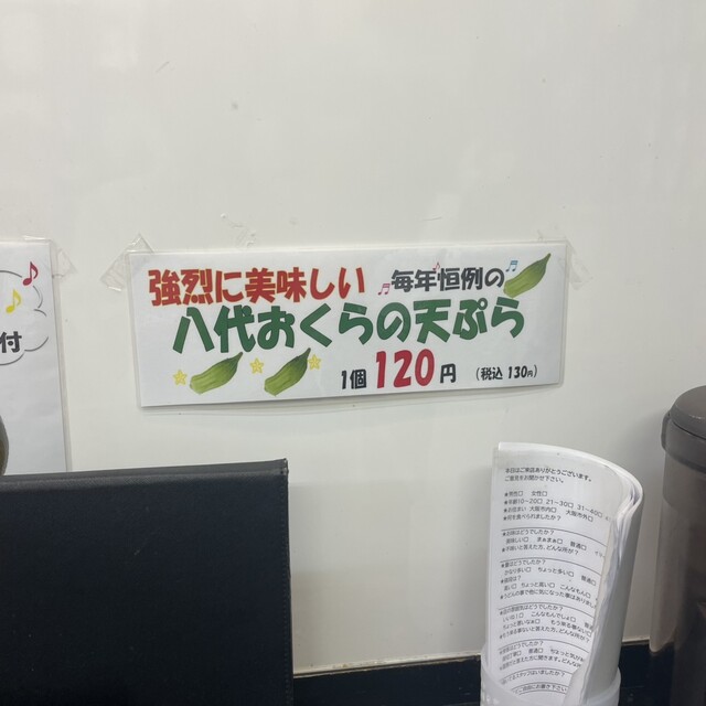 この「八代オクラ」の天ぷらが、うどんのサイドメニューとして、なかなか良い感じなんですわ。
