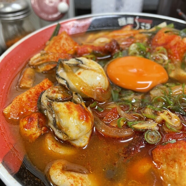 出汁は、極楽うどんのうどん出汁にコチュジャン、韓国唐辛子、ニンニクを加え、コク旨のチゲ風にアレンジしたのだそうです。具は、カキ、厚揚げ、玉ねぎ、椎茸、しめじ、ニラ。そして、青ネギと、韓国唐辛子を多めにふりかけてあります。