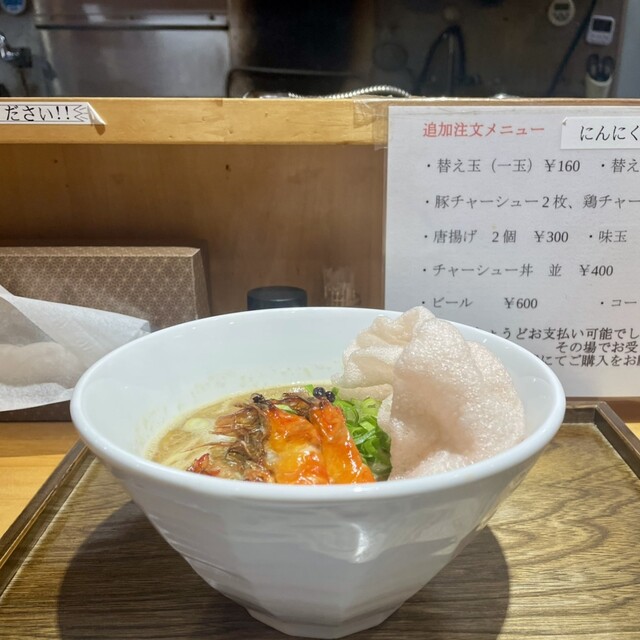 「鶏白湯に味噌付海老頭を入れ、じっくり煮込んだスープに、自家製海老油で整えた一品。