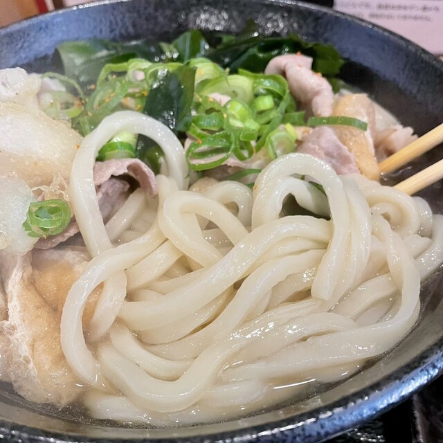 うどんは、中細で、しっかりエッジの立った自家製うどん。うどん出汁は、「北海道産昆布、さば、うるめ、めぢか節をふんだんに使った風味豊かな自慢の出汁」なのだそうですよ。具は、豚肉、しめじ、刻み揚げ、ワカメ、さらに、揚げ餅と、真ん中に小口切りした青ネギ、ナルトが添えられてました。