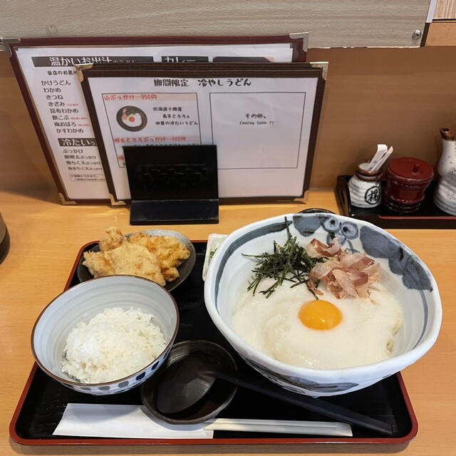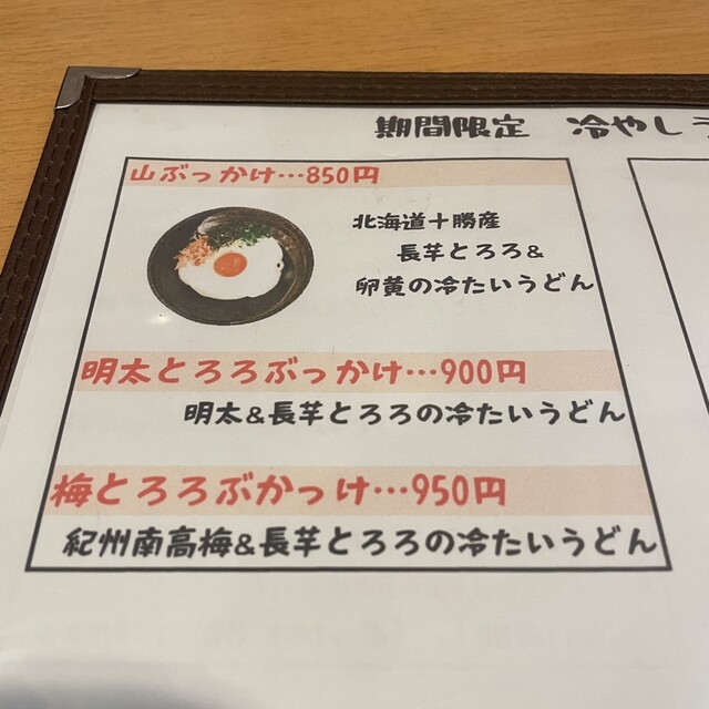 「うどん上々」の夏季限定メニュー、前回は「山ぶっかけ」を頂いたので、今回は「明太とろろぶっかけ」にしました。