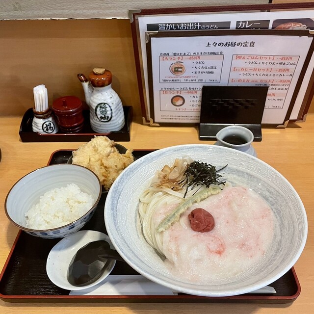 JR環状線玉造駅と鶴橋駅の東側、疎開道路沿いにあるお気に入りのおうどん屋さん「うどん上々」で、夏季限定の「梅とろろぶっかけ」を頂きました。うどんは大盛りで。それに、小ごはんと、鶏天2つもお願いしましたよ。