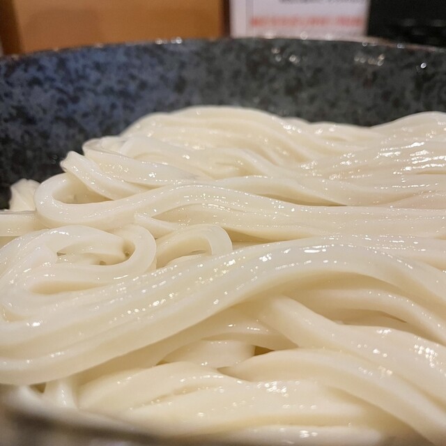 茹で上がったうどんを一度冷水で〆たあと、もう一度熱々に温め直したうどん。