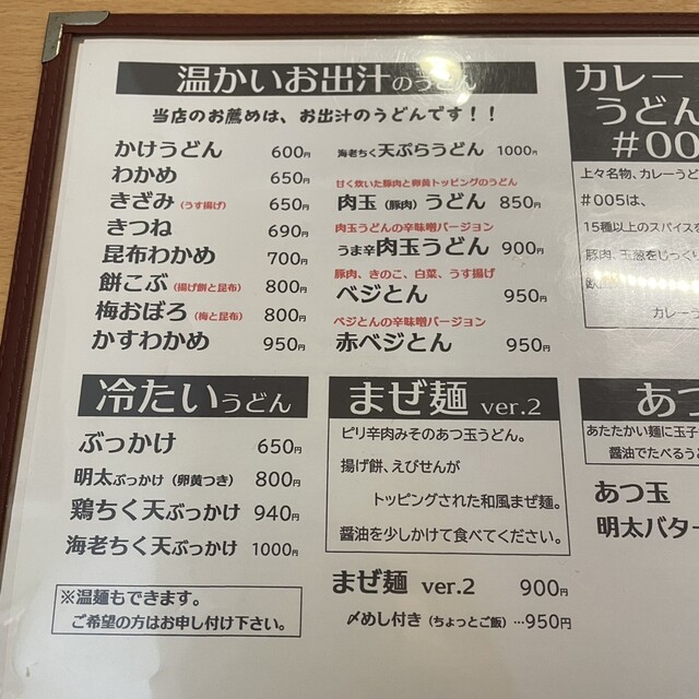 うどんは、「温かいお出汁」「ぶっかけ(冷)」「かま玉」から選べます。