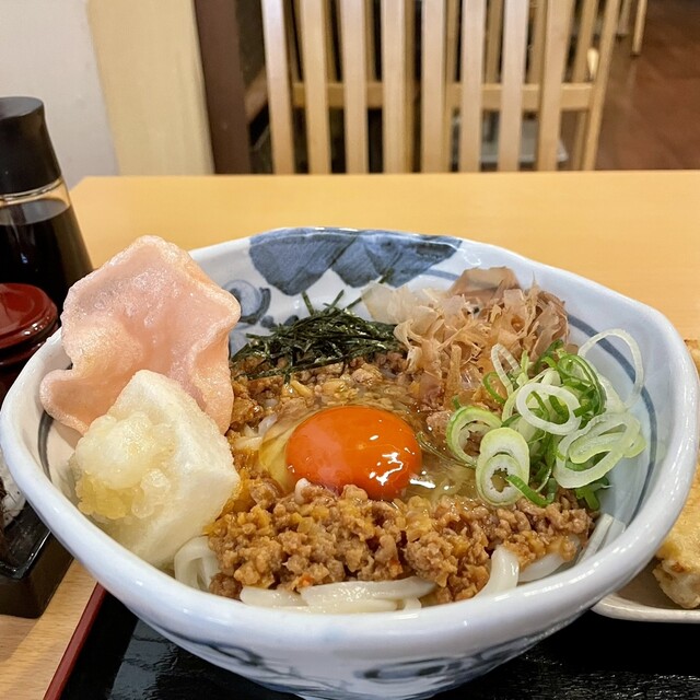 うどんの上には、ピリ辛の肉味噌、揚げたての揚げ餅&えびせん、削り節、刻み海苔、小口切りした青ネギ、そして真ん中には生卵が添えられてました。