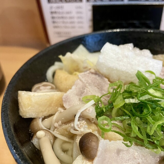麺は中細のツルツル、艶々なうどん。具は、豚バラ肉、白菜、エノキ、シメジ、うすあげ、そして、真ん中に青ネギと、さらに揚げ餅が添えられてました。