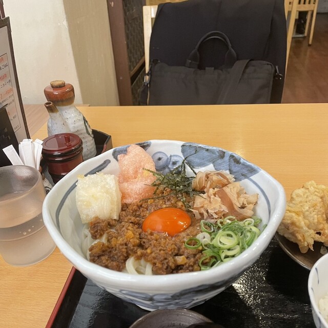 ここのまぜ麺、肉味噌がマジ最高なんですよね。うどんとも合うし、ご飯ともめっちゃ合いますわ!