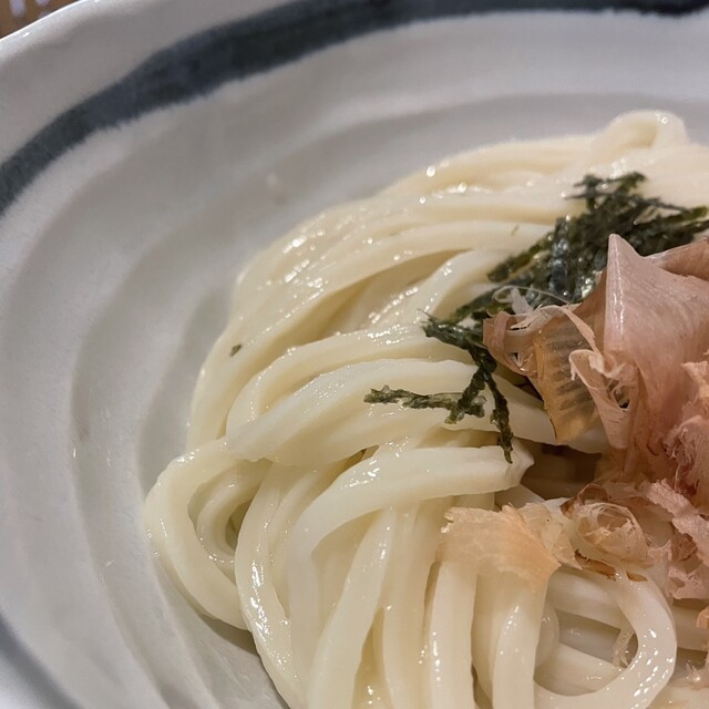 麺は、中細のツルツル艶々なうどん。うどんの上には、削り節と刻み海苔のみ。小口切りした青ネギ、おろし生姜、レモンが別添えされてましたよ。