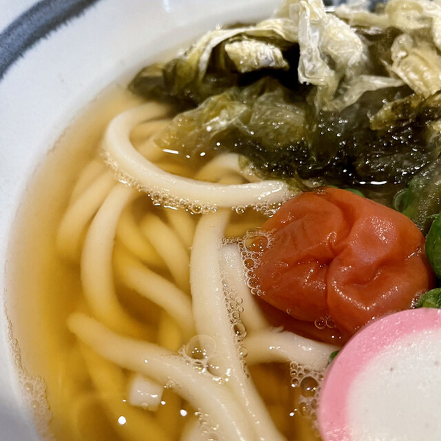 「梅おぼろ」は、かけうどんの上に、おぼろ昆布と梅干しをのせたおうどんです。