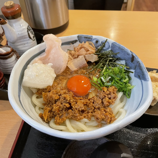 このまぜ麺、熱々でしかもツルツルなおうどんと、ピリ辛な肉味噌、そして卵が絶妙に絡んでめっちゃ楽しい食感&味わいのうどんなんですよね〜