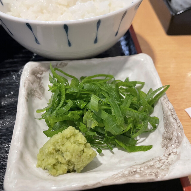 うどんの上には、たっぷりのとろろ芋。とろろ芋の上に、削り節、刻み海苔、大葉の天ぷら、そして真ん中に「明太子」が添えられてました。それに、青ネギとわさびが別添えされてましたよ。