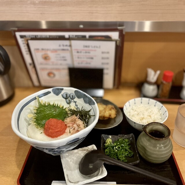 東成区玉津にあるお気に入りのおうどん屋さん「うどん上々」で、夏季限定の「明太とろろ」を頂きました。小ごはんと鶏天1つもお願いしましたよ。