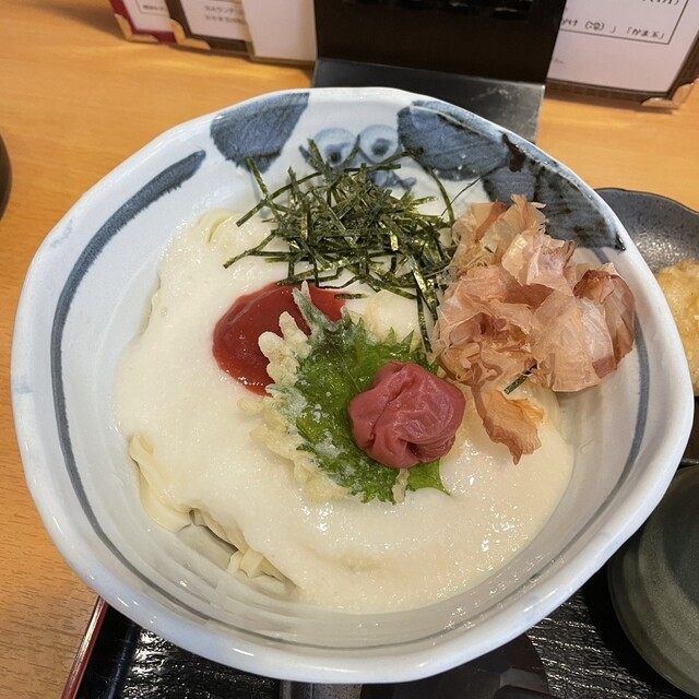 うどんは、中細でしっかりコシのあるツルツルツヤツヤなうどん。めっちゃ喉ごしのイイうどんです。うどんの上には、たっぷりの「とろろ」。「とろろ」の上には、梅ペースト、刻み海苔、削り節。そして真ん中に、大葉の天ぷらとその上に「梅干し」が添えられてましたよ。