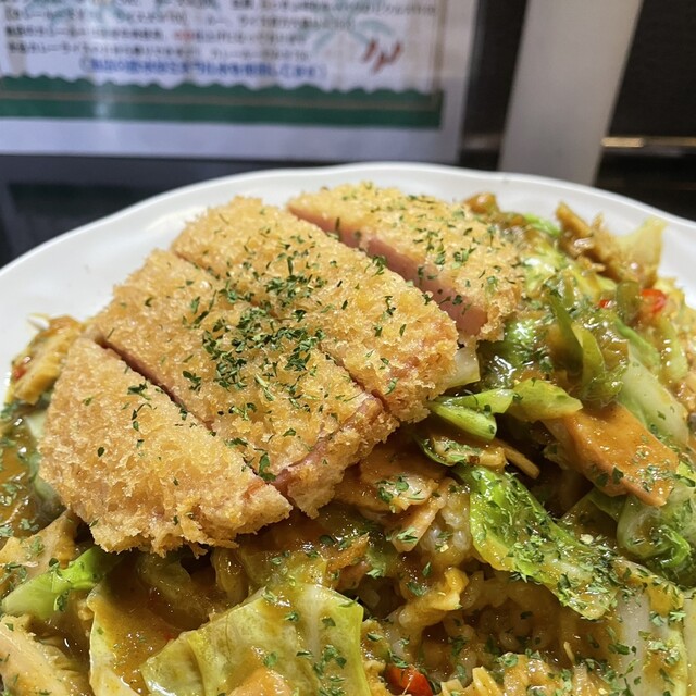 具は、牛の2番目の胃(トリッパー)、ベーコン、春キャベツ、ピーマン、赤ピーマン、その上にハムステーキカツ、そして、上からパセリがふりかけられてました。