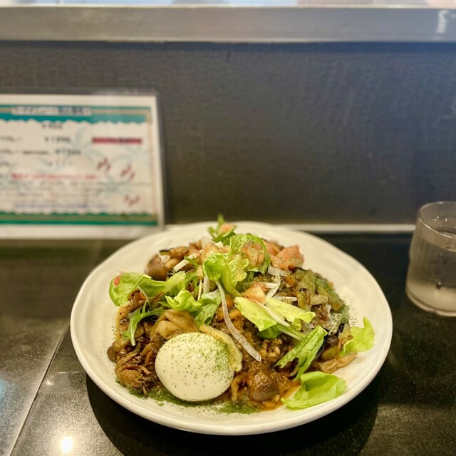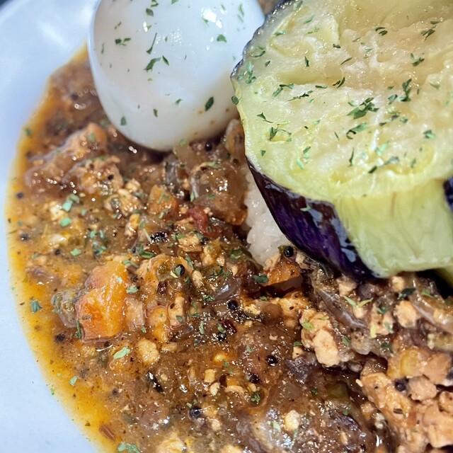 天六にある、お気に入りのカレー屋さん「カルダモン.」で、限定カレーの「サラダ仕立ての辛口鶏キーマカレー」を頂きました。それに、半熟ゆで卵も追加でお願いしましたよ。