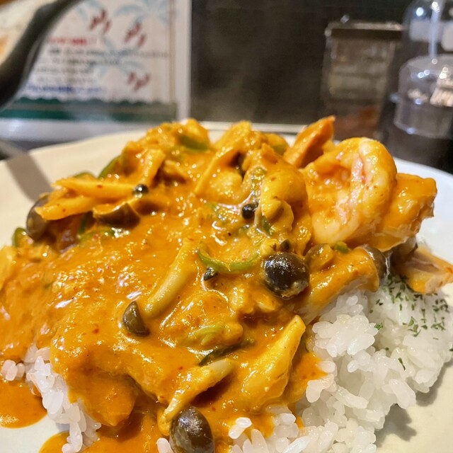 天六にある、お気に入りほカレー屋さん「カルダモン.」で、限定カレーの「赤唐辛子のタイ風レッドカレー」を頂きました。エビか砂肝かの2つのバージョンがあったのですが、エビのバージョンでお願いしましたよ。