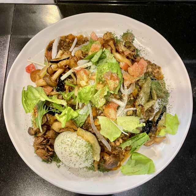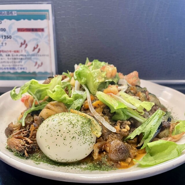 「サラダ仕立ての辛口鶏キーマカレー」は、キーマカレーの上に、グリーンリーフ、水菜、オニオンスライス、素揚げの茄子、素揚げのシメジ、トマトのピクルス、そして、半熟ゆで卵が添えられました。さらにその上から、ドライパセリがふりかけられてましたよ。