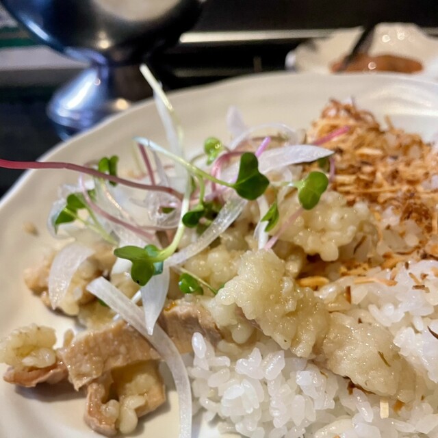ライスの上には、たっぷりのシマ腸、カイワレ、そして、フライドココナッツがふりかけられてましたよ。