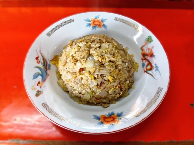 焼めしは、町中華らしい絵柄の深皿に見事な半球体の盛付け