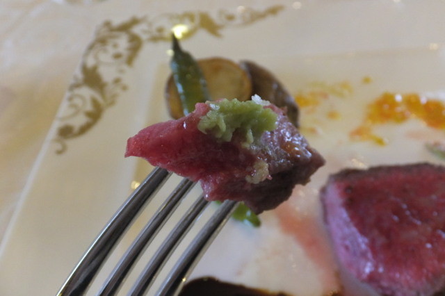 リンコットワインのソースでいただく北海道産の牛肉料理です。ハローヒートオーブンと呼ばれるオーブンでじっくり焼くことでお肉の旨味(アミノ酸)を逃さずじっくり低温で焼かれるでとても味わい深い~