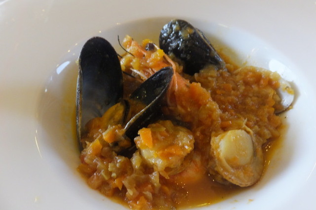 ムール貝やエビやホタテが人参やキャベツと言った野菜のブイヤーベースと共に飾られて