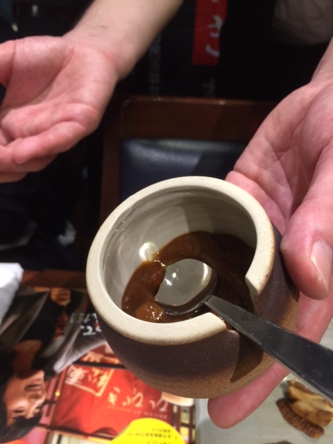 すでにたっぷりのたれに絡まった豚玉ねぎ串がからしと一緒に食べるスタイル~これ久しぶりでとっても美味しかった