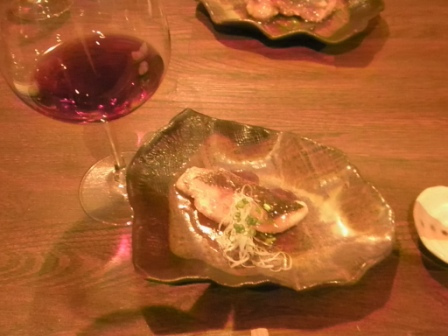 フィレだけに癖がない。つけるのは、塩と、刺身編で登場したわさび塩。「んんん…」といって肉を食べ、「ふごっ」と言いつつワインを飲みます。この辺からお店の空気になれてきて自然とほほが緩む感じが。