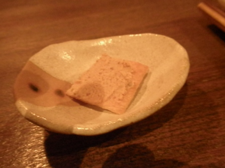 続いてお刺身。左が鯛、右がひらめ。暗い画像で恐縮ですが、ワサビが二種類ついているのがお分かりでしょうか。ひらめについている方は、ワサビにモンゴルの岩塩を練り込んだものとのことで「そのままでいい感じの味になります」、と。アドバイス通り醤油なしでいただきますが昆布締めしてある刺身の風味にはこの味の方がいいかもしれません。日本料理におけるうまみの使い方、すごいですね。子供のころからかなりの年齢の大人になるまで、」ケチャップやマヨネーズの濃い味に慣れていましたが、いつのころからかこのような味を好むようになり…
