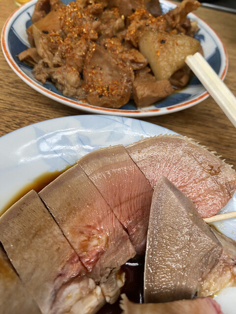 ツル、シンキ、煮込み、カシラ塩、シロたれよく焼き、おしんこ生姜乗っけてお酢、大びん
