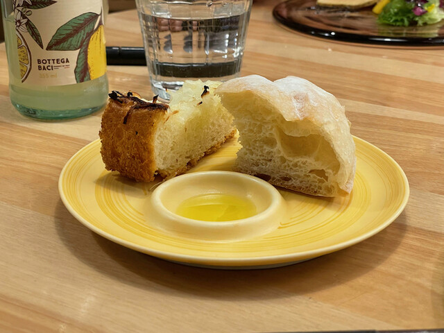 前菜選択1品、パスタ選択1品、メイン選択1品(カップルでは同じ品限定)、デザート1品、カフェ選択1品の¥6,000コース。プロセコとノンアルコールで乾杯。2杯目は赤グラス。カメラを構えると進んで撮ってくれたり、店の食器について妻と語っていると、食器や、オリジナルのカトラリーについての解説などしてくれたりと、店のスタッフの人のカジュアルさと熱心さも良い感じ。