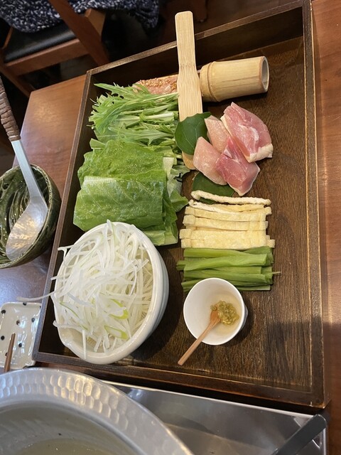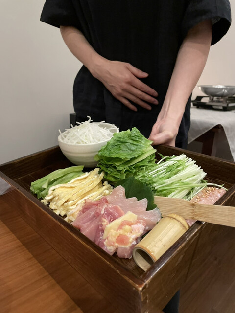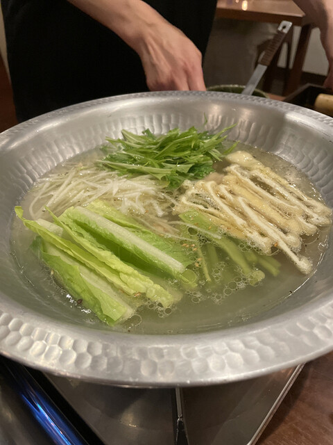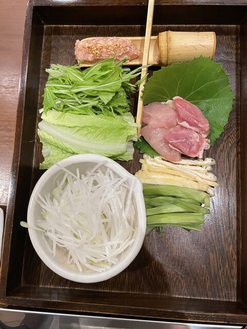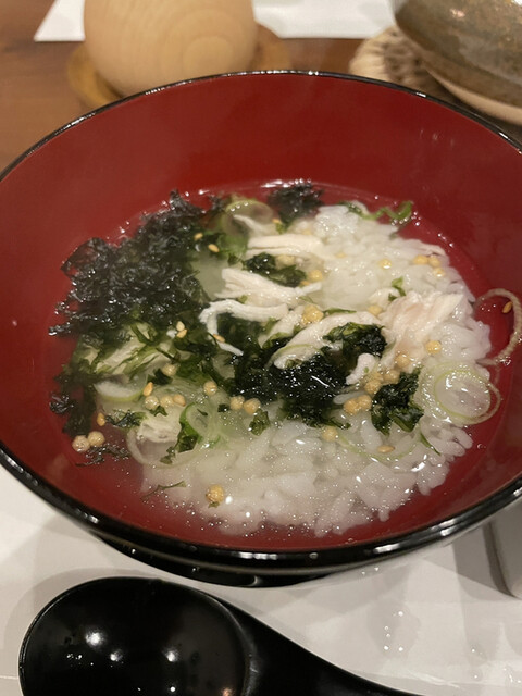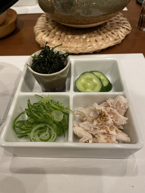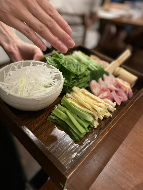 鶏鍋コースの最後は山梨県の軍鶏の鍋です。軍鶏の切り身、軍鶏団子に加えて、ロメインレタスの芯、ヤマクラゲ、細切りの油揚げ、大根の細切りと面白い具材の組み合わせです。軍鶏は歯応えがあって噛むほどに旨味が広がります。ロメインレタスの芯は火を通してもサクサクしていてヤマクラゲは鍋では初めて頂きましたが、コリコリの触感がアクセントになって面白い。真似してみよう。
