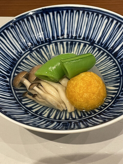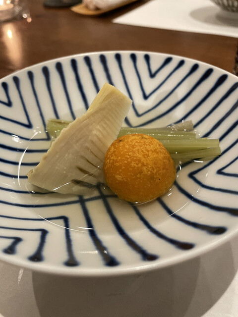 続けては野菜の炊き合わせ。タケノコ、フキに加えて、モチモチのカボチャ団子が絶妙なバランス。こちらも出汁が良く効いてますね。
