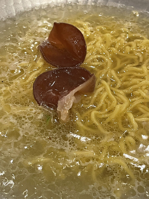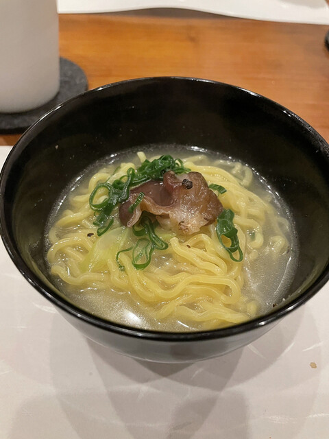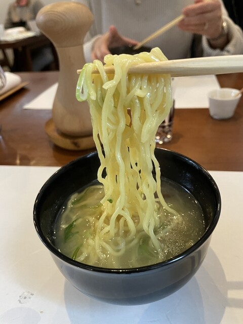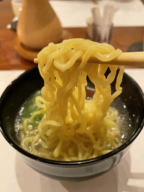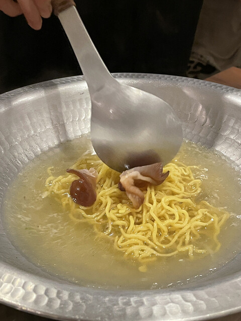 〆は雑炊か、中華麺を選べるので、我々は中華麺にしました。スープには鶏の出汁がたっぷり出ていて、中華麺にも合いますね。黒胡椒をかけると味が締まって更に旨くなります。