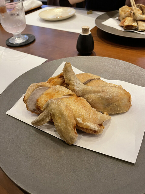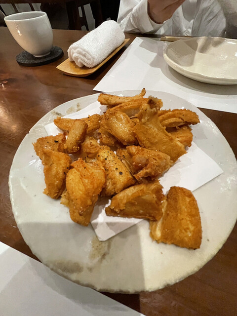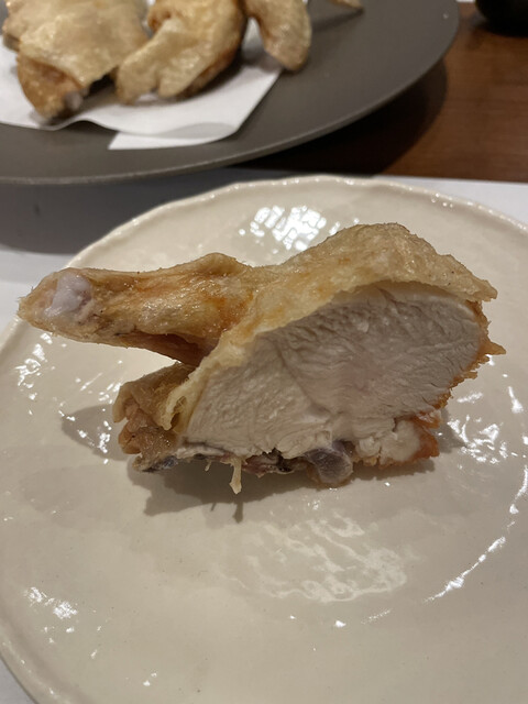 ウマズラハギとアジのお造りに続いて、いよいよ鶏の素揚げが出てきます。「まずは胸肉からお召し上がりください」とオーナーシェフの奥様。衣もなにもついてない、まさに素揚げ。少しだけ塩味がついていて、外の皮は薄くてパリッと揚がり、胸肉はパサつかずにとってもジューシー。 高温で一気に皮を揚げて、その後は温度を下げて揚げるらしい。岩手の若鳥で、身は柔らかく、素揚げなので油を身が吸っておらず、軽くて延々に食べていられそうだ。