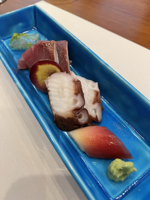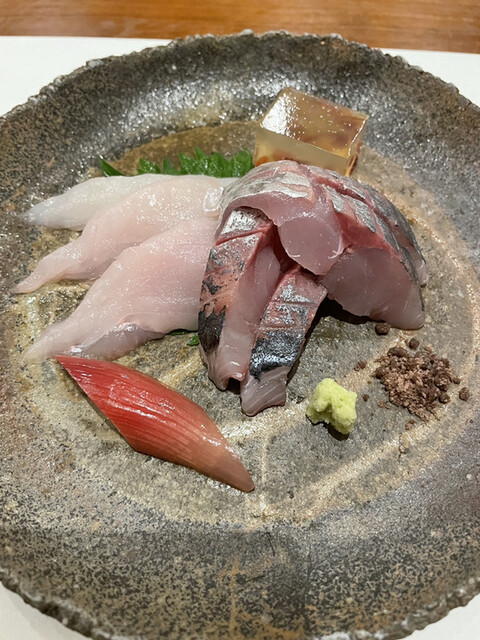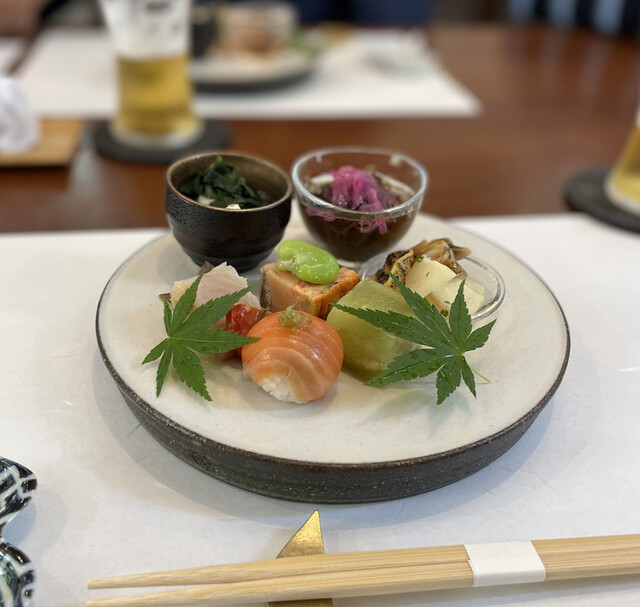 一品目は茶碗蒸し。甘鯛のような白身の切り身がはいり出汁が効いていて落ち着く味ですね。そして前菜の盛り合わせ。どれも素材の味を生かすために味付けは控えめで、妻も自分もこういう薄味の料理が好きなので堪能。素材が良くないとできない味付けだね。