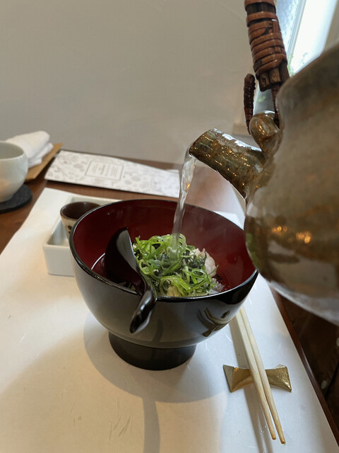 最初はハトムギと蕎麦の実の冷製雑炊。出汁が効いていて美味い!