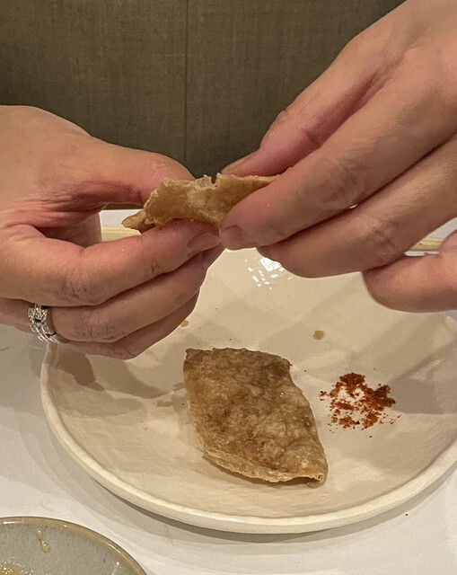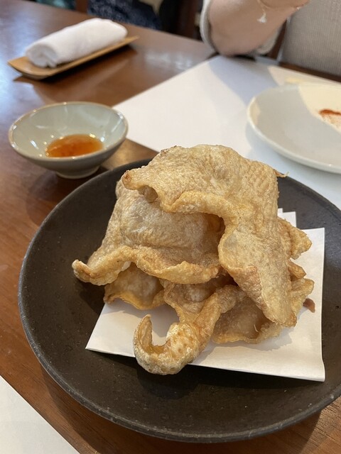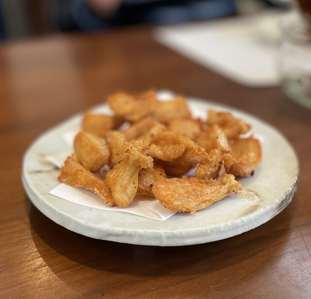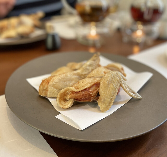 追加でお願いした鶏皮の素揚げはパリッパリで薄焼き煎餅を食べているみたい。どうやってこんな風に揚げることができるんだろう!