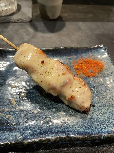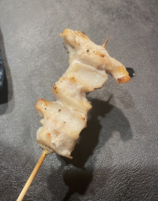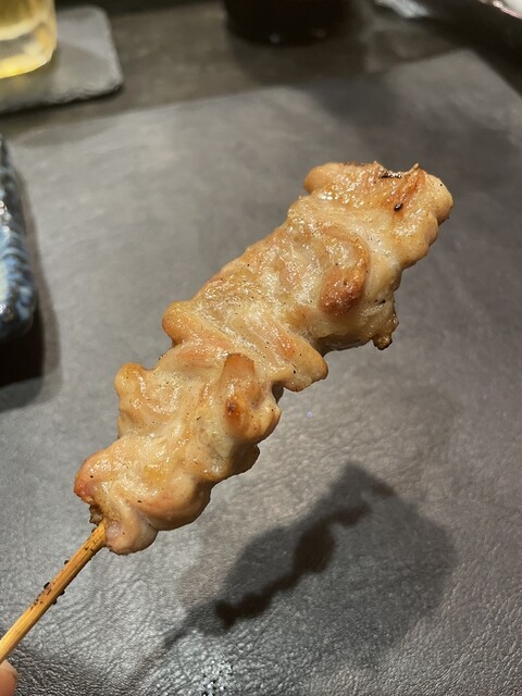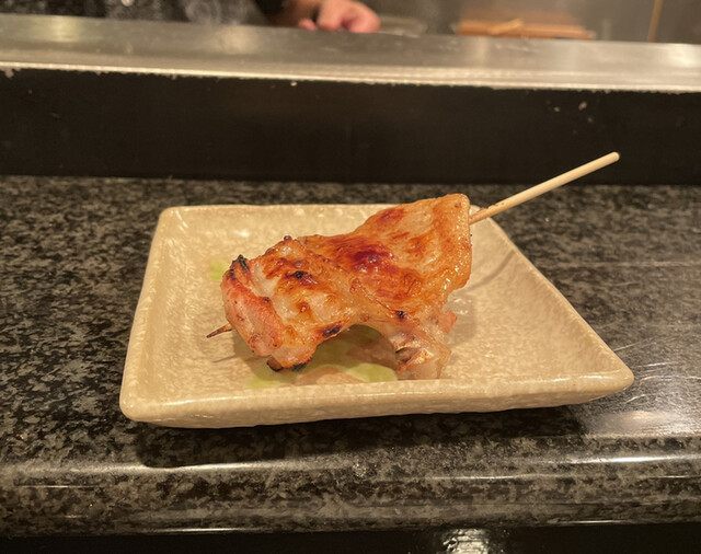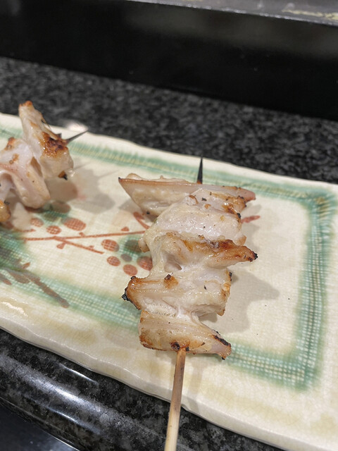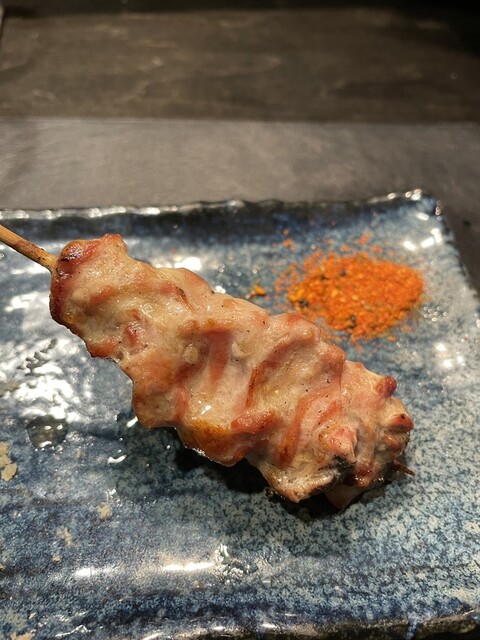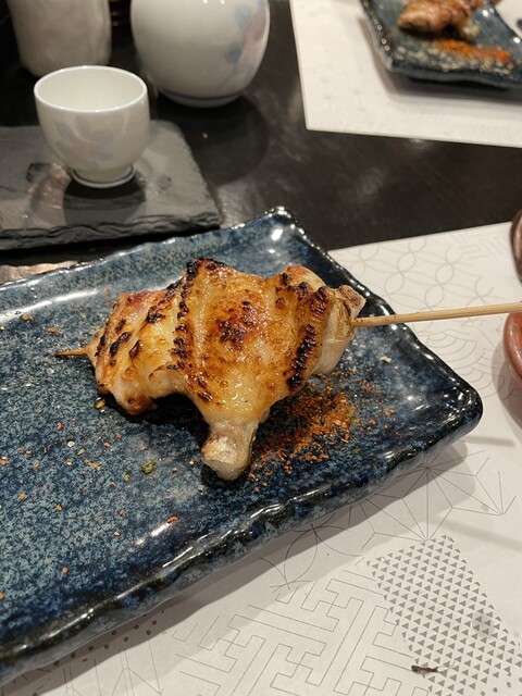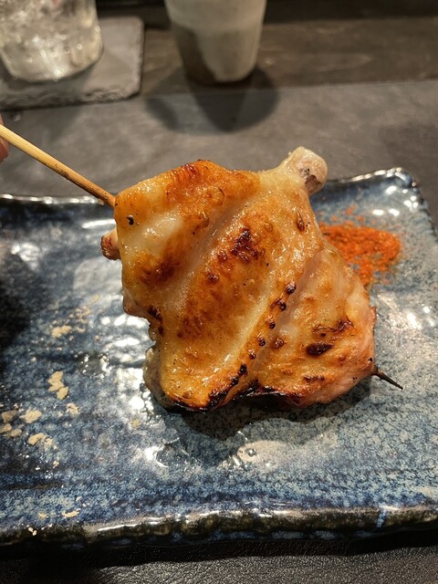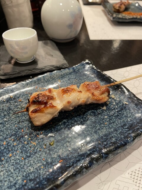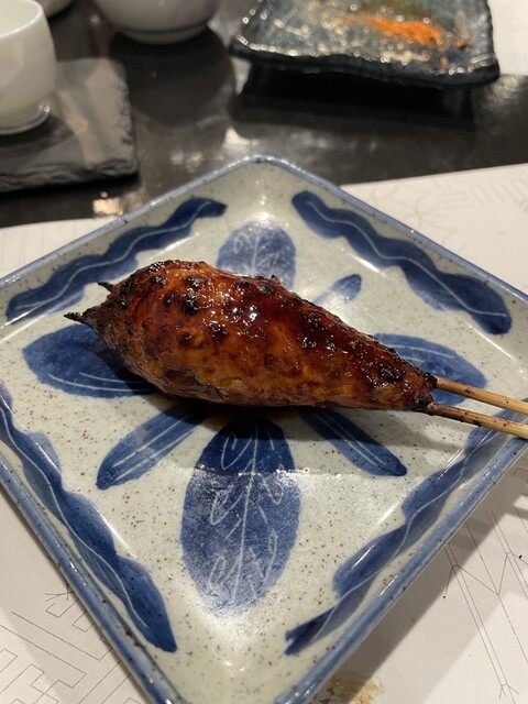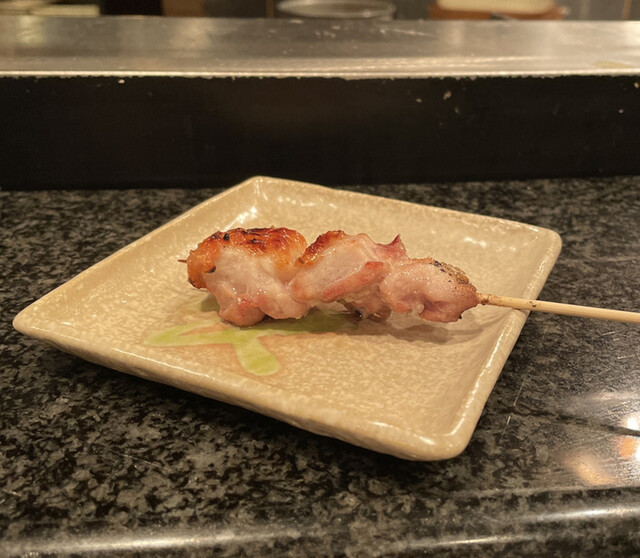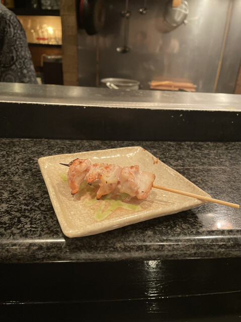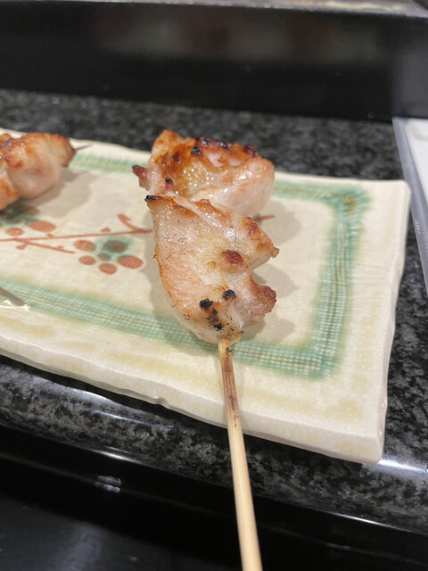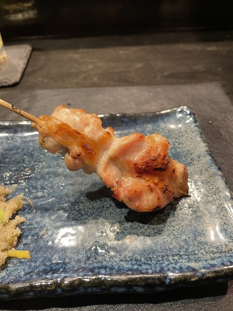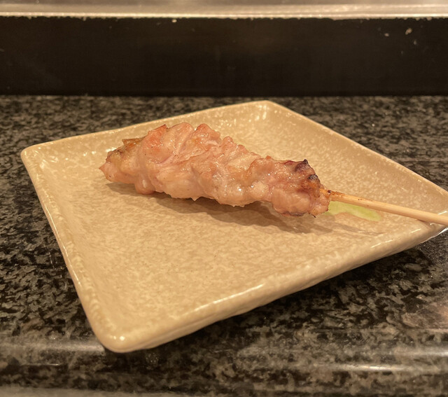 つきだしの後は焼き鳥が始まります。炭火で焼いた焼き鳥は塩味でとってもジューシー。特に、オーナーさんが以前、養鶏場のお手伝いをされていた「かたせ赤鶏」は食感も良くて胸肉でもパサパサしてなくてジューシーで美味い! 比内地鶏のような感じかな。(食感はもう少し柔らかいが)