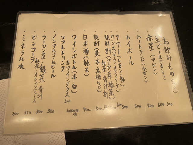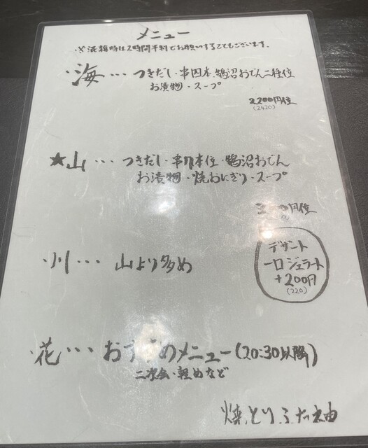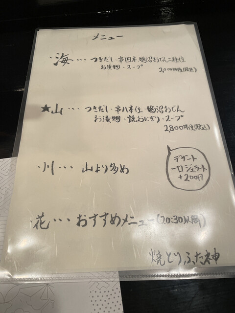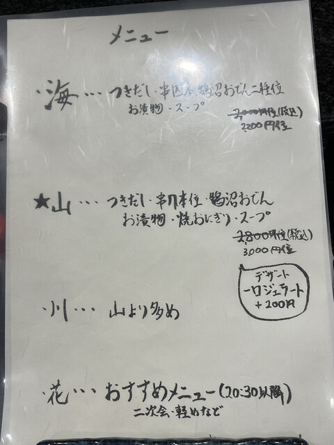メニューは3つのコースで海 税込2000円(つきだし、串4本、おでん2種、お漬物、スープ)、山 税込2800円(つきだし、串8本、おでん、お漬物、焼きおにぎり、スープ)、川 (山より多め)でお値段不明、それに花(20:30以降)というもので、山をオーダーしました。