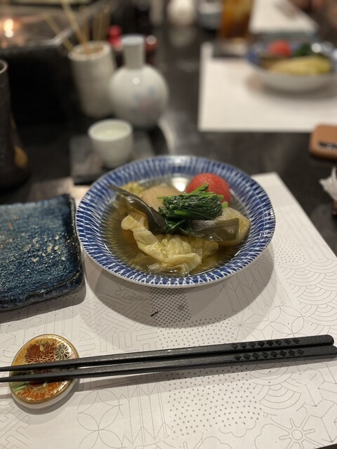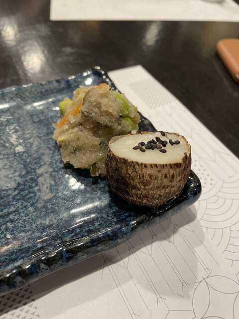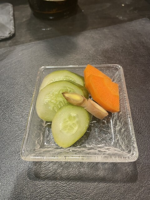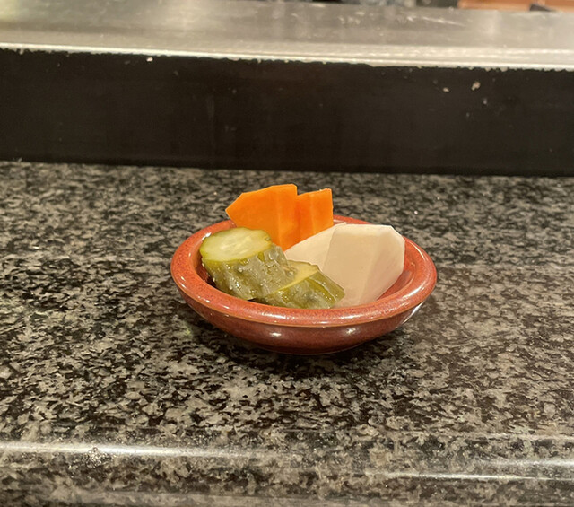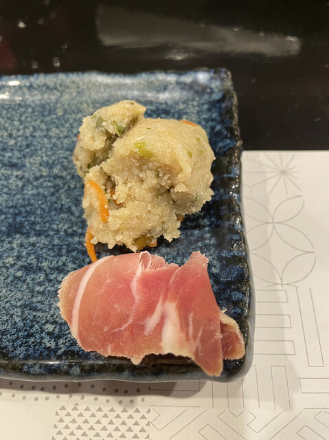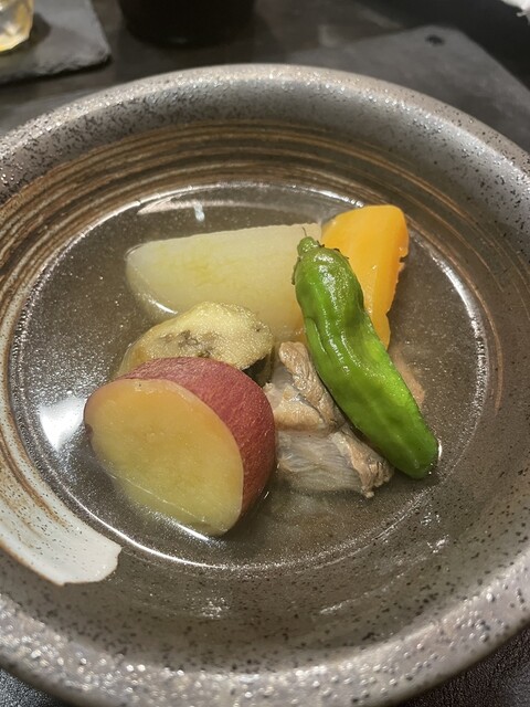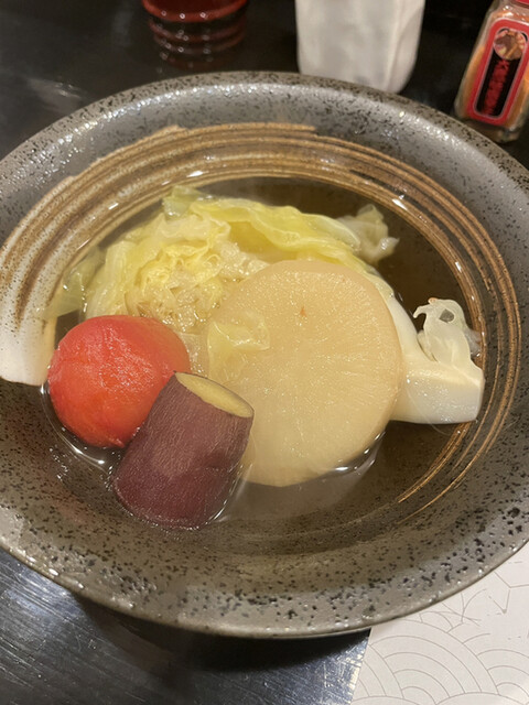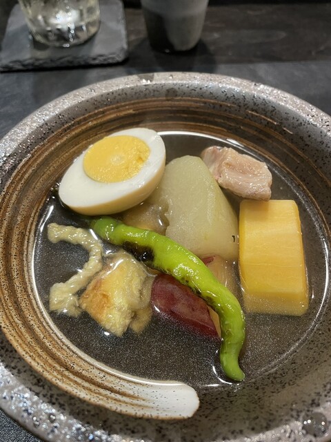 途中でトマト、キャベツ、大根などの藤沢野菜のおでんが供されます。このおでんは、鵠沼海岸駅の横のcomadで「鵠沼おでん」として提供されていたもので、鵠沼魚醤の出汁が効いていて胃袋に染み渡ります。オーナーさんは以前、藤沢のとある有名なうどんや豚丼などを出すお店でおでんを担当していたとのことで、色々な経験が味に出てますねぇ。