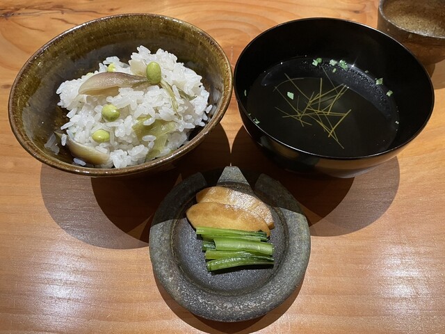料理の最後は、枝豆、茗荷の炊き込みご飯と、鰹出汁吸い物、人参細切り。炊き立ての炊き込みご飯が優しい味でホッとするね。