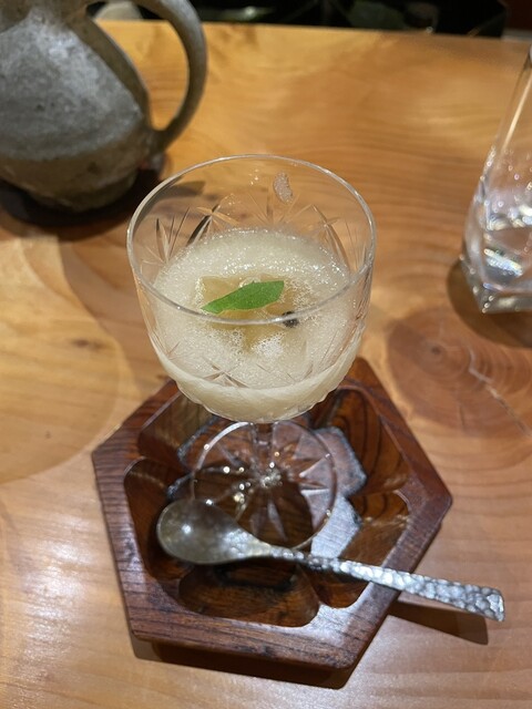デザートは、新水ナシと生姜のコンポート、生胡椒、ホーリーバジル添え。