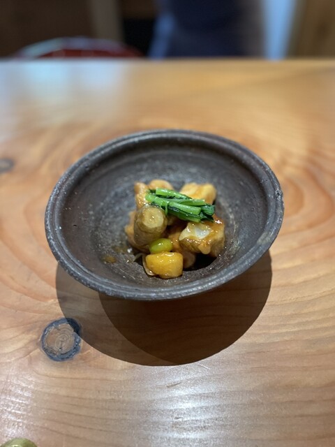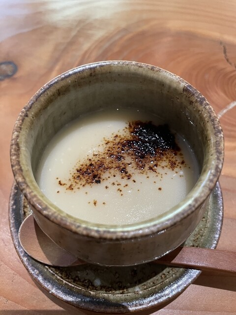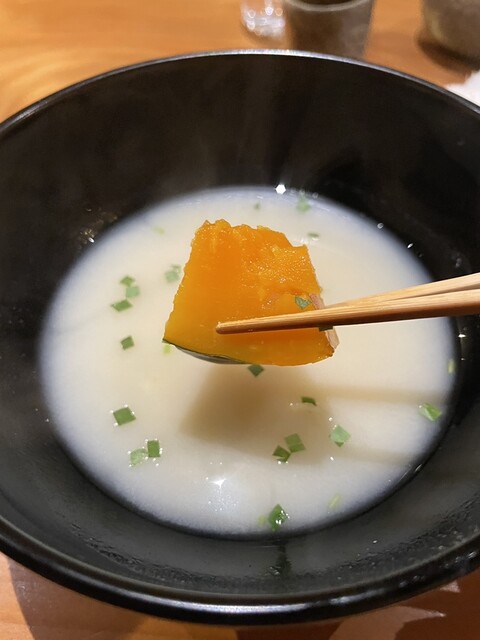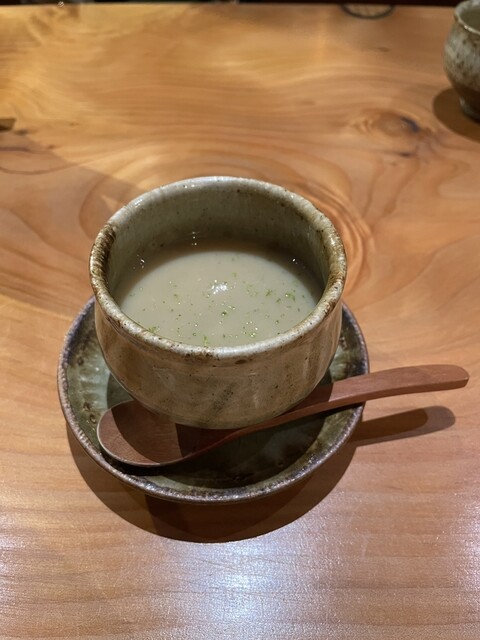 次は、茶碗蒸し、焼きトウモロコシのポタージュがけ。店主さんに伺うと、単なるトウモロコシではインパクトがなくて、試行錯誤した結果、醤油をつけて焼いた焼きトウモロコシをポタージュにしたらば、面白い組み合わせになったとのこと。素晴らしい。