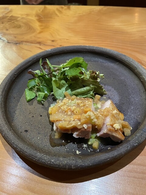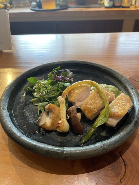 次に、大山鶏の胸肉をパリっと焼いて、タマネギ、白味噌、甘酒ピュレのソースと、そして魚のアラでとった出汁をかけた一品。大山鶏がジューシーで柔らかいこと。そして甘目のソースとの相性もばっちり。