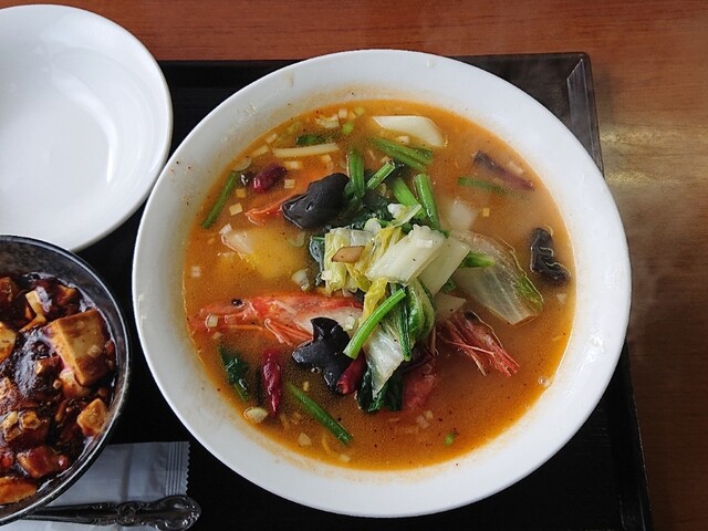 今回はしっかりありました♪“新ネタ”!それは「赤海老の唐辛子煮込み麺」=「水煮蝦煨麺(スイジュウシャアウイメン)」¥880。水煮肉片は知ってますが、これは初めて。日本語表記で、大方察しはつきました。私はこれに「ミニ麻婆丼」¥260を追加♪合計¥1140のランチになりましたが、ここでは全く惜しくない♪♪♪
