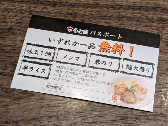 一度お邪魔すると「なると家パスポート」がもらえます。これはトッピングのサービス券なんですが、なんと!無期限!!1年半前にもらってたチケットが使えました♪また、次も使えますよ♪って、そのまま返されました(´ω`*)食べる前に、また食べに来ることを誓った(罠)w。