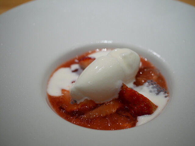 人気の名店でしたが、なんとか予約が取れて初めての訪問です。シックなインテリアのオシャレな店内でカウンターに案内されました。コースが始まると「アミューズはモウカザメの心臓です...」と料理に一瞬驚いたところに、クスッと一言「とっても美味しいんですよ!」これでやられてしまいました。緊張した客の心を一瞬でほぐしてしまう接遇で既に楽しい!グラスワインもボルドー、アフリカ、イタリア3種きっちりとテイスティングさせてくれ、好みの品の提供してくれます。それぞれ違いがわかりやすく、1杯目はルカーレ プリミティーヴォ プーリア アパッシメント(イタリア)をお願いしました。濃厚ですが魚介との相性も悪くないです。大船渡産の生牡蠣は海ブドウを添えてで新鮮さを感じます。生ウニとカリフラワーのムースは冷たいジュレが旨味を多く含み生うにの味わいにさらなる深さを感じさせ、旨すぎます。この辺で2杯目にクライン ザルゼ(アフリカ)のカベルネをお願いしました。少しスパイス感が強くこの後がお肉なのにちょうど良さそうです。ジャパンエックス豚のローストはわずかにピンクのお肉から甘みのある油が浸みてきます。食べ応えも十分でパンもどんどん食べてしまいました。デザートまで会話を楽しみながらガラスの扉の向こうにちょっぴり見える厨房の様子も見ることが出来て五感を超えた楽しい時間を過ごすことができました。本当に楽しかったです、ご馳走様でした。