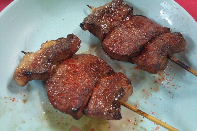 肉と肉のあいだに脂を挟んで串刺ししているので、脂っこさがジューシーで旨い!
